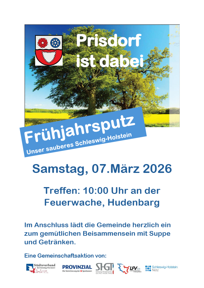 Am Sonnabend, den 07. März, findet wieder die landesweite Müllsammelaktion „Unser sauberes Schleswig-Holstein“ statt. Auch in diesem Jahr ist die Gemeinde Prisdorf wieder dabei und freut sich über zahlreiche Unterstützung von Groß und Klein!